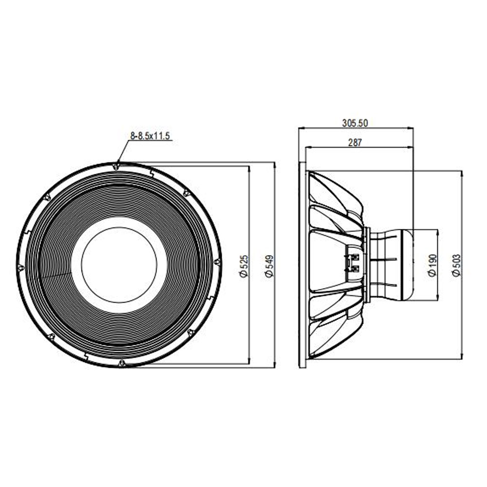 磁路设计采用了沿着音圈绕组放置的大型钕磁铁。这使得我们能够将音盆的振幅推至峰峰值50毫米。独特的气隙通风设计确保了良好的空气流通,极大地提高了这款扬声器的可靠性。我们还开发了一种制造深铜帽的新技术,并应用于该设计中,深铜帽可覆盖音圈的整个运动范围。该设计还进一步采用了三个不常见的大型定心支片,通过垫片隔开,将热压的编织导线连接到顶部定心支片上,此外还有加固的音盆边缘、加固的音盆折环连接部位、加固的定心支片与框架连接部位等等。
